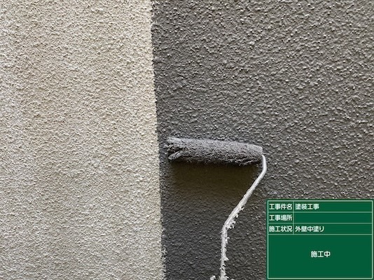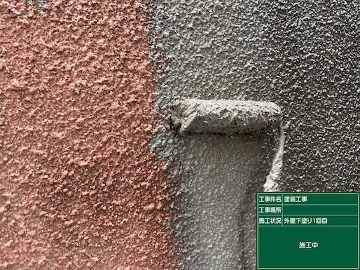 下塗りで整えた下地の上に上塗り塗料を1回目に塗布する工程です。